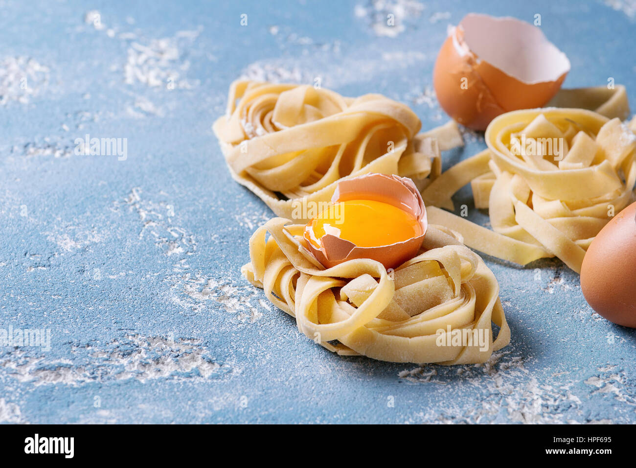 - Trenzado Casera Cruda Fresca Cruda Pasta Tagliatelle Con La Yema De Huevo Shell Y Cortador De Pasta Azul Claro Sobre Fondo De Hormigon Fotografia De Stock Alamy Low Calorie Quick Pasta Recipes,