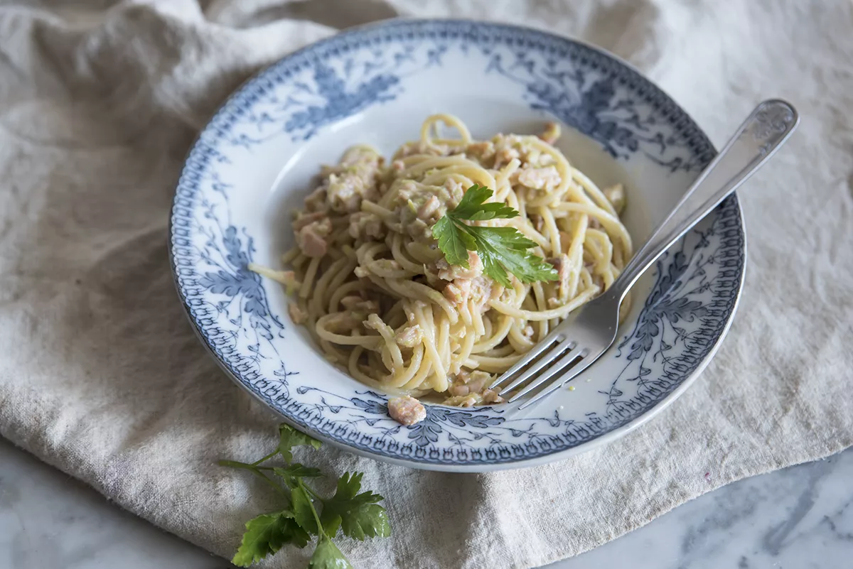 Spaghetti Alla Crema Di Porri E Salmone Ricette Light Melarossa Pasta Sfoglia Furba